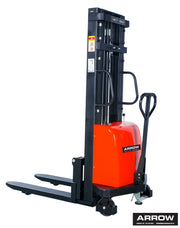 This electric hand stacker uses a battery-powered hydraulic to lift up to a max of 3 metres.  It Features  adjustable straddle legs which allows it to pick up all pallets up to 1200mm wide