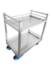 This 304 Grade Stainless Steel two-tier industrial platform trolley cart has a heavy 250kg carrying capacity.. Its large 125mm (5″) rubber wheels allow the trolley to glide over small bumps and debris in any warehouse, even with heavy loads, making it ideal for industry applications. Its durable design and construction makes it perfect for busy warehouses, yards, and sheds. It is Idea for the food industry